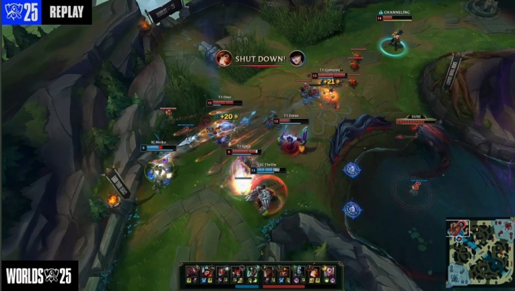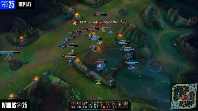 中期野区团战,T1上野开送,厄塔汗团战,Faker阿卡丽单杀Rookie,Oner皇子扣iG配合小吕布女枪开扫,T1打出1换4回头吃掉厄塔汗,经济落后2k。