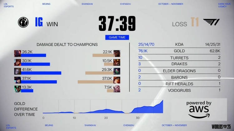 后期小龙团T1再杀iG四人,但上路团战,Rookie发条拉T1三人,Wei猴子一棒敲掉小吕布女枪,Faker阿卡丽送Wei双杀,iG摧枯拉朽0换5很科学团战团灭T1,回头吃掉大龙,经济反超3k。最终iG吃掉二代大龙,下路冲上T1高地,Wei猴子开T1两人,T1再无一战之力,iG顺利团灭T1拆掉基地扳回一城。