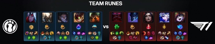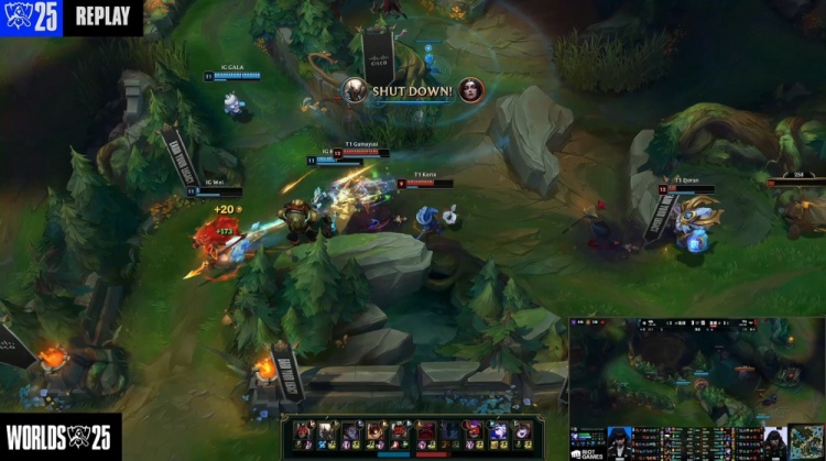 【20:36】厄塔汗团战,多兰奥恩关灯叫羊撞三人,Faker妖姬瞬间双杀iG上野,GALA吉格斯开炸,iG打出2换3,Keria璐璐与Faker妖姬下路绕后,Faker踩掉GALA吉格斯,正面Rookie塞拉斯残血等到TheShy韦鲁斯到位,多兰卖掉自己送TheShy韦鲁斯大人头,下路继续大乱斗,Faker踩掉TheShy韦鲁斯,iG四人阵亡,T1打出2换4,回头吃掉厄塔汗,经济领先3k。