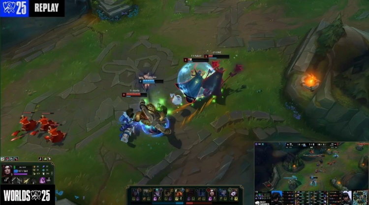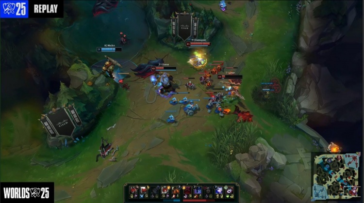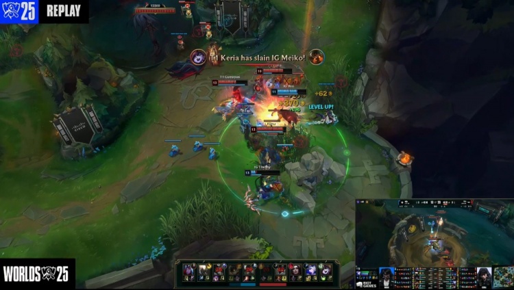 【25:31】T1中路推进,Meiko泰坦闪现钩打出Keria璐璐闪现,大龙团,Rookie塞拉斯拿到羊,正面多兰奥恩关灯羊配合Faker妖姬进场收割,T1打出0换4,一波推平iG基地拿到比赛胜利,晋级瑞士轮正赛,iG勇夺17强。
