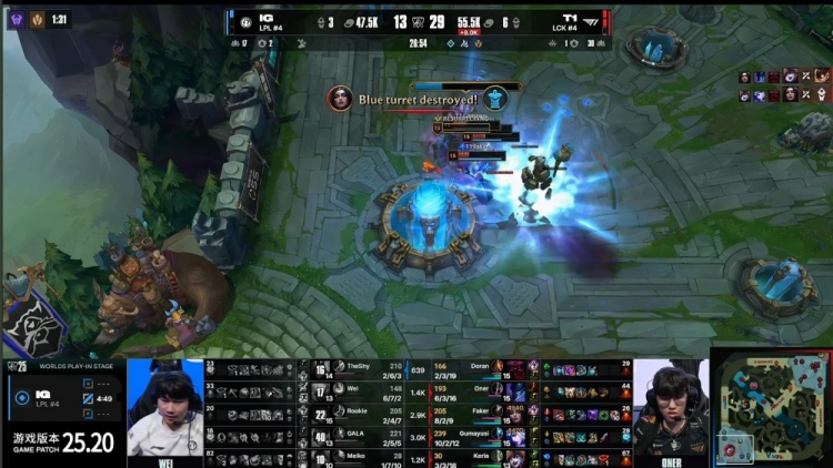 中期双方持续下路大乱斗,你杀我来我杀你,但Oner梦魇关灯配合多兰奥恩叫羊,Faker妖姬不断逮捕GALA吉格斯与TheShy韦鲁斯,T1接连打出大优势团战,经济领先3k。