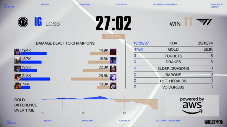 后期iG正面团战逐渐伤害走低,大龙团又是Faker妖姬配合Oner梦魇关灯进场收割,T1打出0换4,一波推平iG基地,以3-1拿到比赛胜利晋级S15瑞士轮,iG勇夺17强告别S15世界赛。