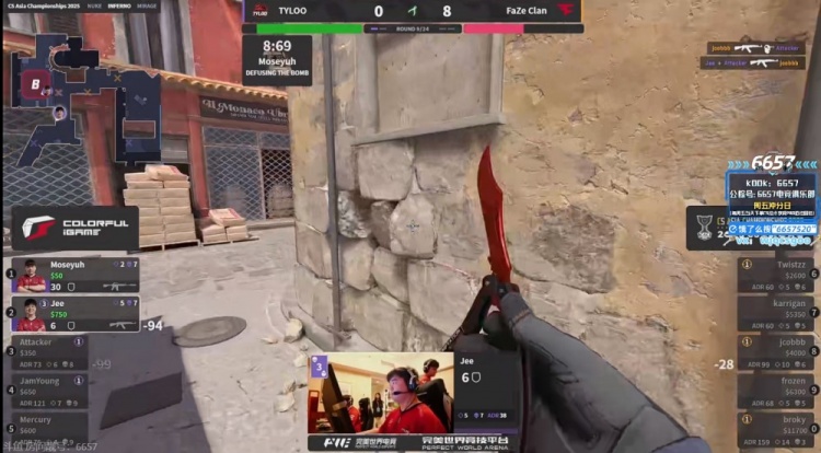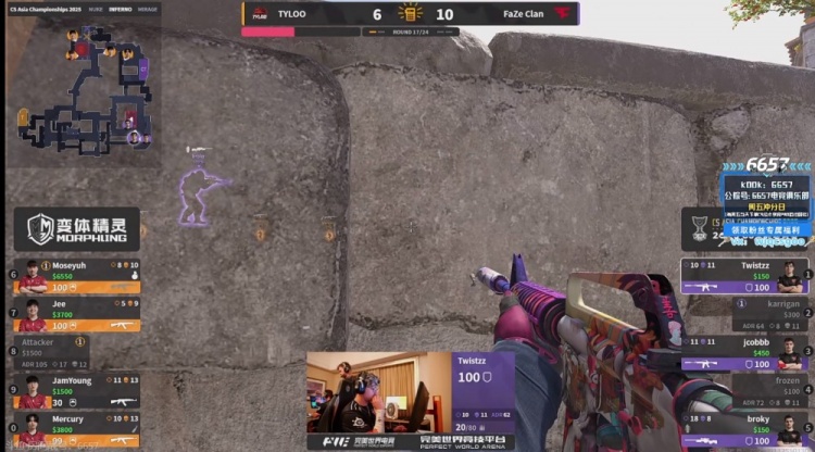 最后一局FAZE提速A区,但是Attacker+Mercury各砍双杀直接顶住局势!TYLOO半场拿下3分!3-9!