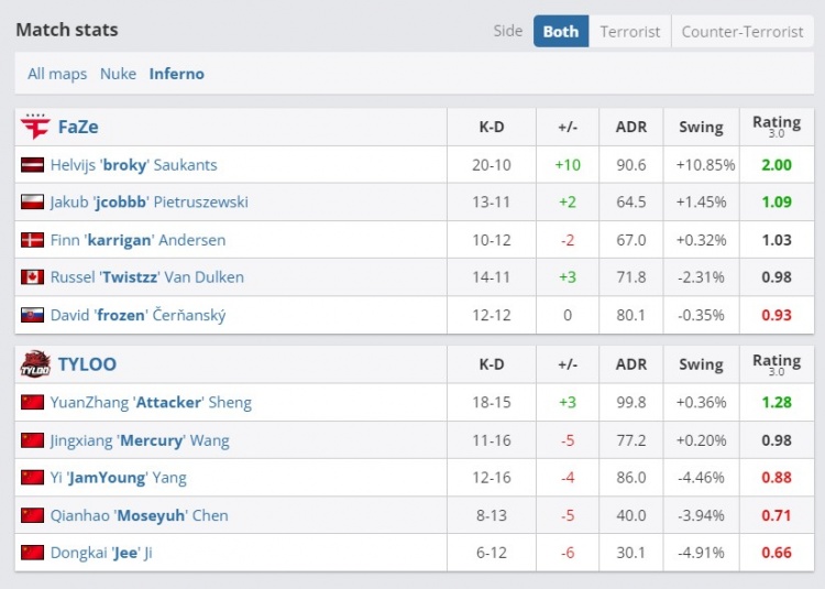 图二来到TYLOO选择的小镇,上半场broky步枪爆种,TYLOO丢掉B区的4v2回防一度开局0-8落后。关键时刻Jee捡AK拿下3v3回防建功,Attacker联手Mercury在A区双人五杀帮助TYLOO半场追至3-9。下半场TYLOO丢掉手枪局后凭借Mercury和Attacker的破点钢枪翻盘追分,但一波飞二楼失败后Faze没再给机会,最终TYLOO在自己的选图上以7-13失利,比赛被拖入到决赛图Mirage!
