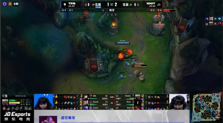 【13:58】TES入侵100T野区,双方打野互换,369开车留人,Creme瑞兹爆轰三杀,TES打出1换4,中路推到100T一塔,经济领先4k。