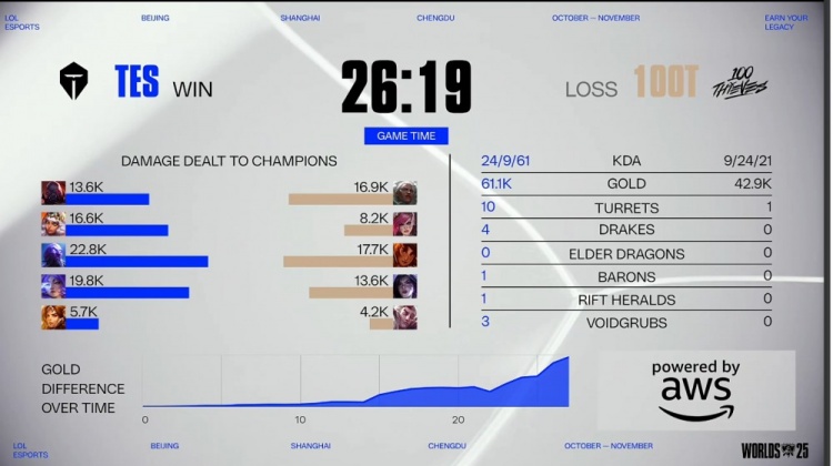 后期龙魂团哥哥芸阿娜被100T五人集火带走,此后100T正面不堪一击,TES打出0换4拿到火龙魂,TES经济优势来到1w。最终TES掏掉大龙,100T前来大火收汁,Creme与哥哥各取双杀,TES轻松推平100T基地拿到比赛胜利。