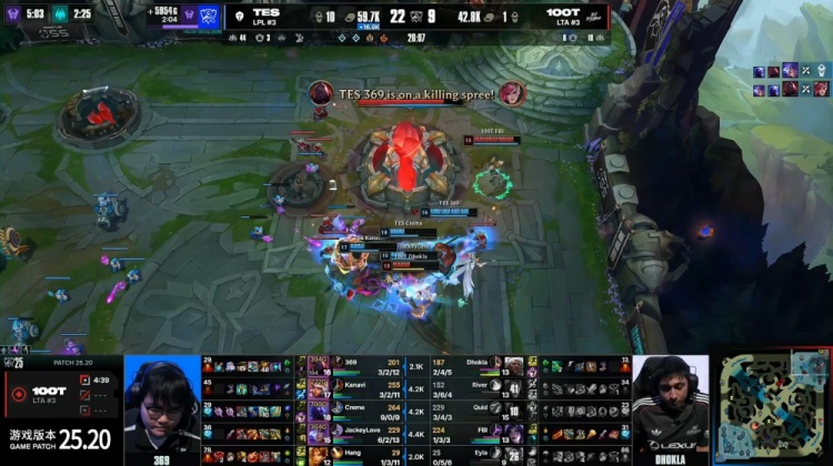 【25:02】大龙刷新,TES开掏大龙,100T过来接团大火收汁,Creme与哥哥各取双杀,TES打出1换5团灭100T,一波推平100T基地拿到比赛胜利。