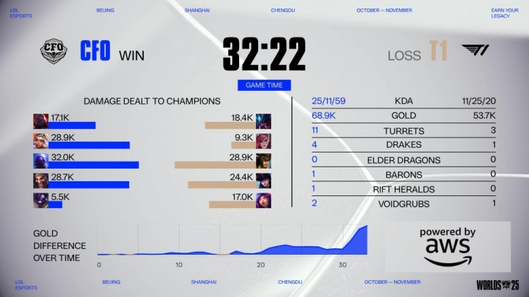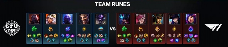 后期大龙团双方持续拉扯,T1率先打出1换3后,双方战至小龙,CFO被T1在大小龙之间拉扯,多兰雷克塞挖进人群送头,Junjia野区绕后逮捕Keria再杀Oner,CFO如愿以偿拿到大龙,HongQ瑞兹拿到双杀,CFO打出0换4,回家休整后一波冲上T1高地推平基地拿到比赛胜利。