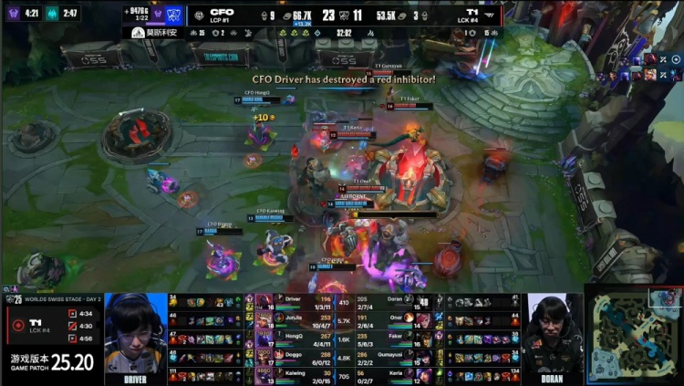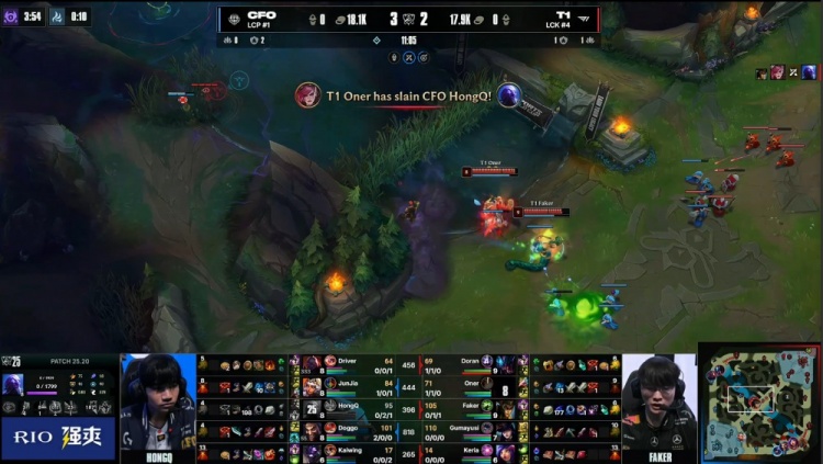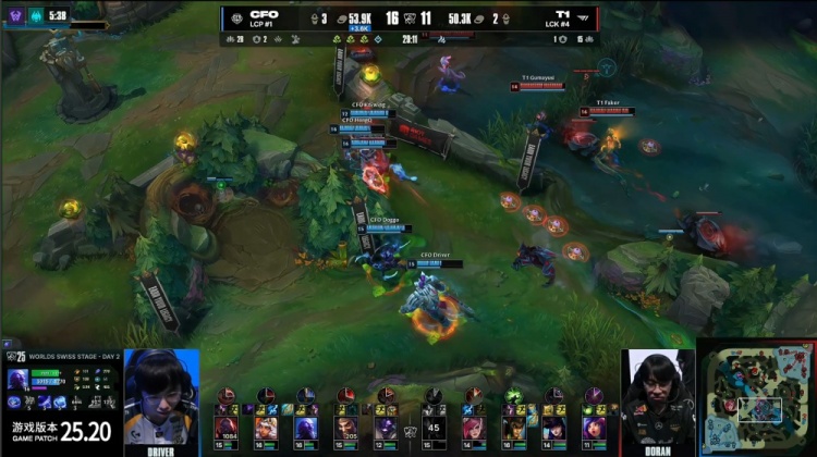 【17:12】Faker蛇女上路配合Oner击杀Driver,中路Keria妮蔻大招打出Doggo德莱文净化,T1三人不敢追击德莱文后撤,CFO推掉T1中路一塔,双方经济持平。