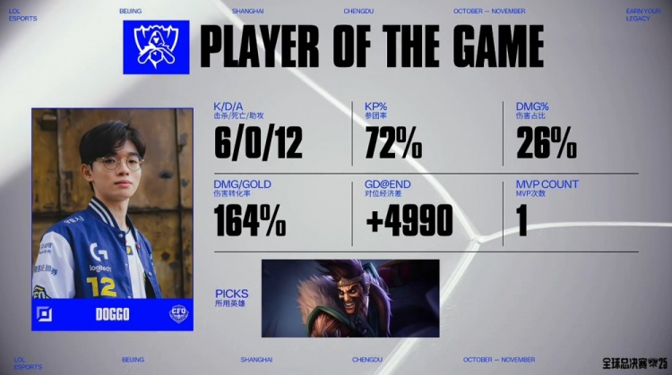 本场比赛前期Doggo德莱文单独去上,线杀多兰雷克塞提款,巢虫团Doggo再杀Oner,HongQ中路被抓后,复活TP正面开车带队友冲到Faker与多兰脸上,Junjia奇亚娜拿到双杀。