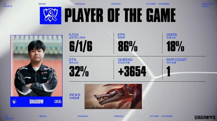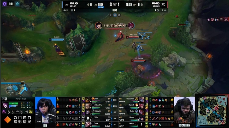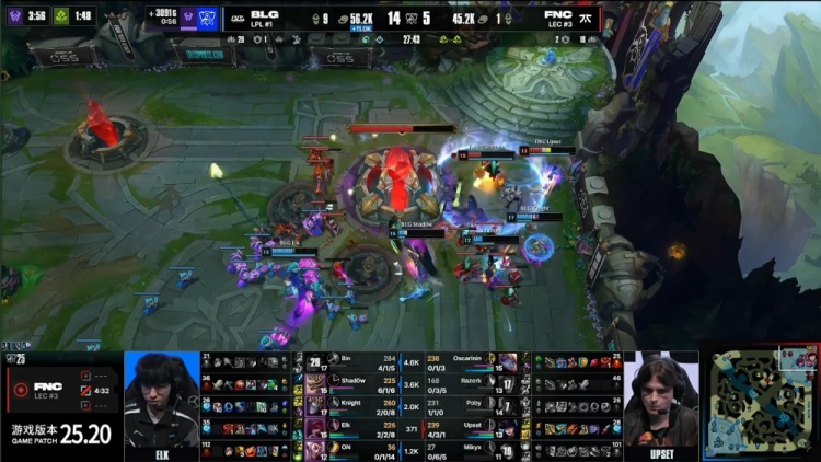 中期中路团战,shadow冥犬锁头Upset女警,阿Bin鳄鱼开大进场将其咬掉,shadow击杀FNC野辅拿到双杀,BLG打出1换3,经领先3k。后续BLG轻松吃掉厄塔汗后中路推进,shadow冥犬再锁头Upset,阿Bin咬掉oscarinin波比人头,BLG打出1换3,回头吃掉大龙,经济优势来到1w以上。