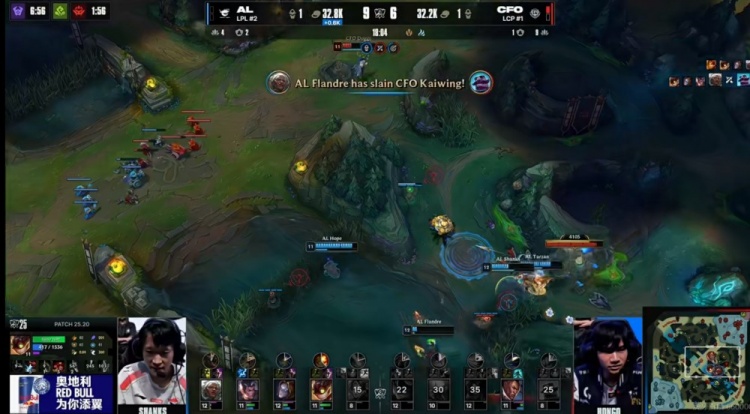 【17:55】AL用先锋撞掉中一塔,回头开打第三条小龙!CFO想接但是Rest兰博落单被开用金身+大招拖时间!AL强杀掉兰博,HongQ阿卡丽进场搅局,但是侧翼Hope炸弹人躲开了Junjia潘森跳大,自己不断给足输出!AL打出1换4,拿下第三条小龙!AL完成经济反超!
