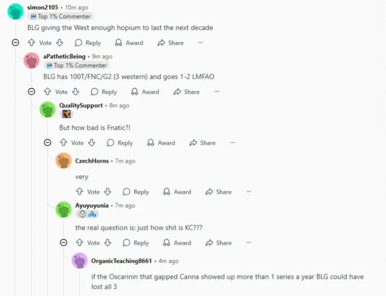 [-]BLG正经历一段极度虚假的旅程:他们面对三支西方队伍打出了1-2的战绩。