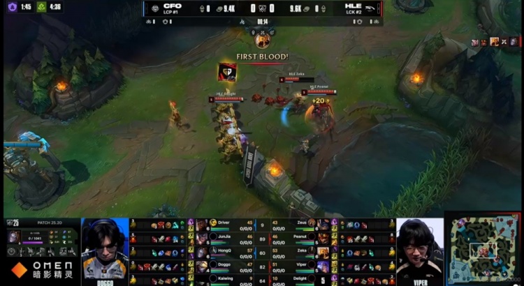 首局比赛CFO打出三路线优,但是上路一波团战强行追击,虽然4人越塔打出0换3,但是被Zeka沙皇反手推三个拿下双杀!随后的小龙团Junjia赵信抢到小龙但是正面HongQ发条又被一推带走,Zeka沙皇12分钟5-0已经拦不住了啊!虽然中期CFO借助发条+娜美双大差点打出完美团,但是HLE没给机会,rush掉大龙之后Zeka沙皇一个反向推再秒发条,Doggo伊泽瑞尔也倒下之后CFO没输出点了!HLE一波0换4,中路一波结束比赛,先拿一分!