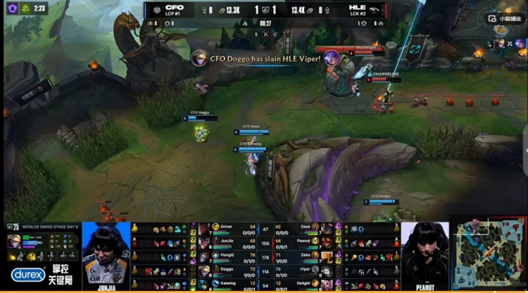 【26:35】Delight洛直接交大招强开,CFO下路组交双闪+Kaiwing娜美大招没能拦住人,绕后的Zeka沙皇赶到,HLE三个大招强行秒掉了CFO下路组,但是HongQ发条卷大两个,Junjia赵信开大强行拿到双杀,双方3换3拉开!