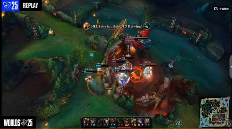 【8:20】HLE打完一只巢虫之后想撤,Doggo伊泽瑞尔Q+平A疯狂追击,打残Viper芸阿娜之后一个大招配合Junjia赵信完成强杀!随后虽然CFO四人越塔再强杀两个打出0换3,但是Zeka沙皇赶到推回三个,复活的Viper芸阿娜补充输出,这波Zeka沙皇收下双杀,HLE回头收完三虫!