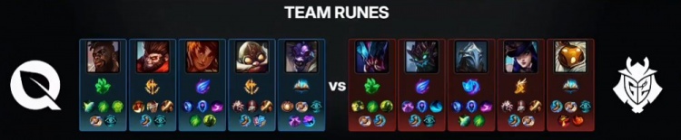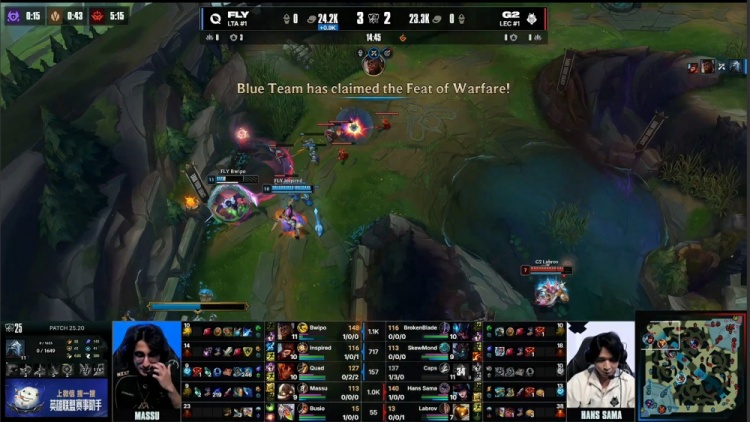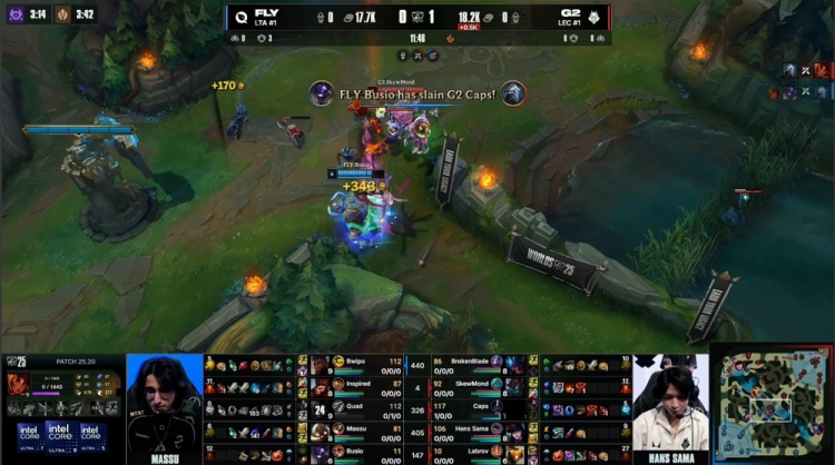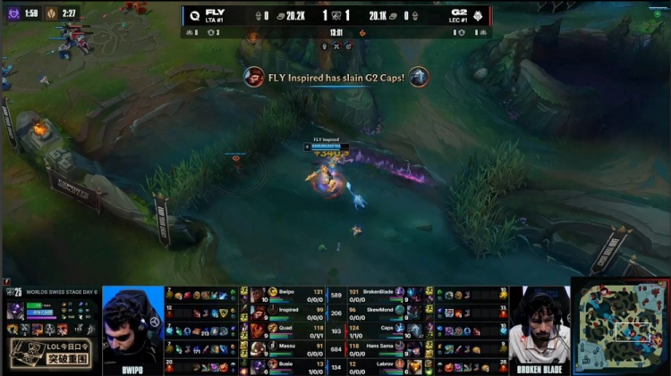 第一局前期双方持续发育,Quad岩雀中路主动发难反被Caps维克托反杀拿到一血,但河道Inspired猴子切掉Caps,Labrov巴德龙坑再送一个,FLY经济领先2k。