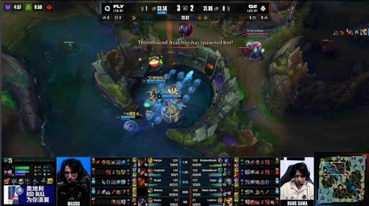 中期小龙团Inspired猴子单切HansSama女警,FLY打出1换2。虽然G2后续听牌炼金龙魂,但FLY经济优势已然来到5k。