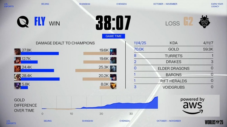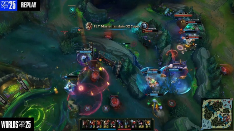 后期FLY持续拍拍大龙拉扯G2,Caps没闪想看自家蓝buff被杀,战绩来到1-5。最终FLY强吃大龙得手,下路一波推平G2基地先下一城。