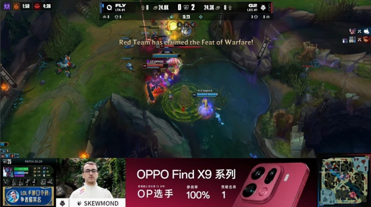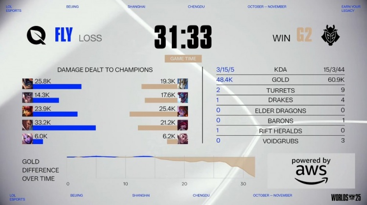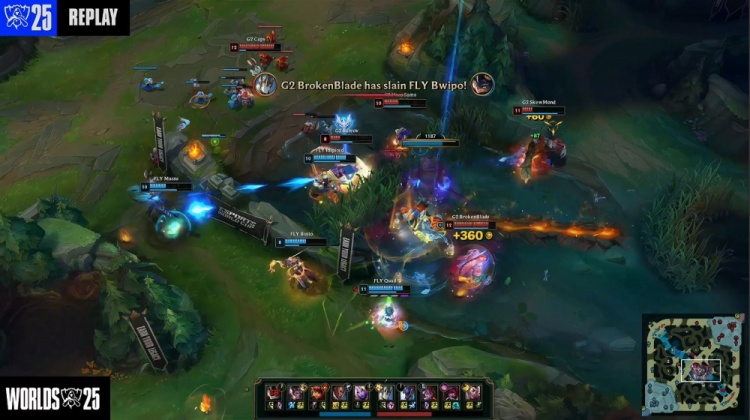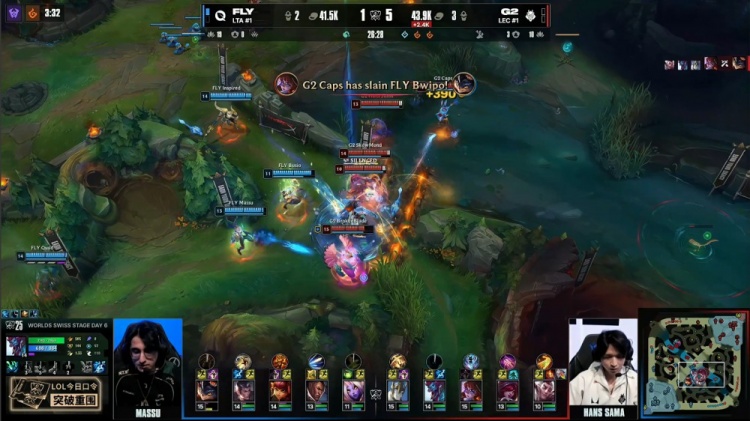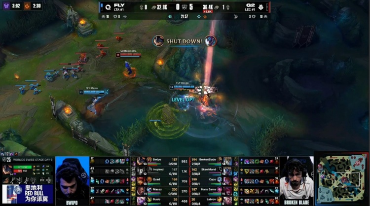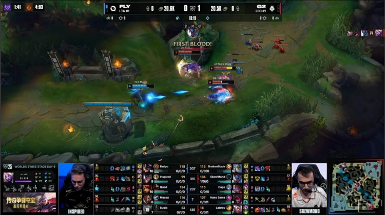 中期SkewMond巨魔河道闪现撞墙送Bwipo兰博大人头,但后续野区团战Bwipo瞬间被融化,G2回头吃掉大龙,经济领先5k。FLY还要接团又被G2打出0换2,G2经济领先来到6k。