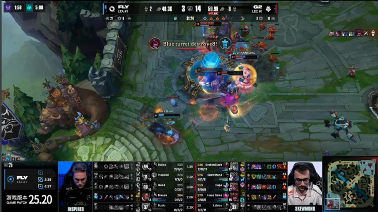 【13:20】G2三人下路塔前强杀Busio索拉卡得手,后者有闪不交只能交出一血给到SkewMond巨魔。