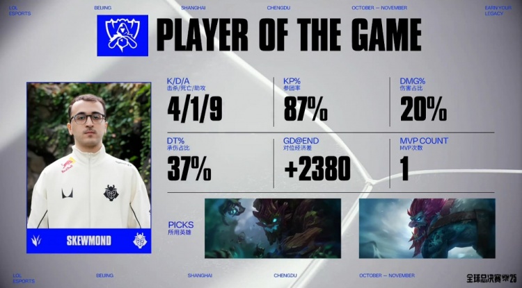 第二局前期SkewMond巨魔三路开抓次次得手,Bwipo兰博河道被Labrov洛抬飞,BB加里奥跟上将其融化,G2经济领先2k。