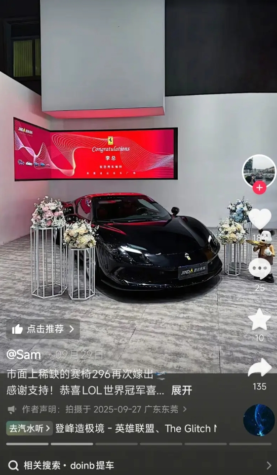 而在9月底曾有汽车博主晒出动态,恭喜某LOL世界冠军喜提选配红色赛车椅的法拉利296,其座椅形状与糖小幽自拍中的车辆一致。