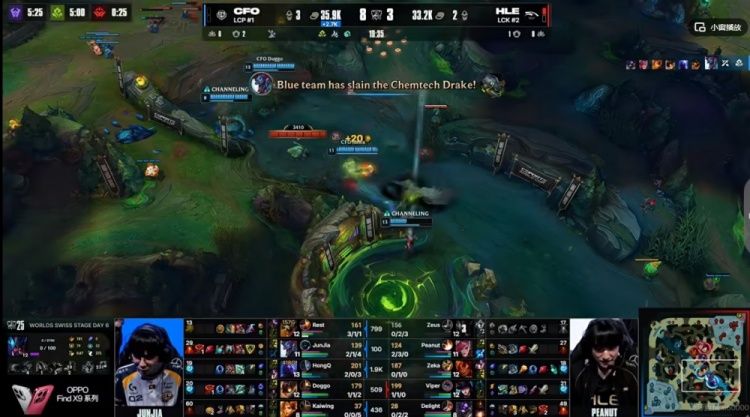 【17:55】Junjia巨魔坐车一个大循环自己撞墙,自己被开但是实在很能抗揍啊!侧翼Zeka岩雀吃到炸弹人大招直接被秒!但是回头Zeus雷克塞大招配合Peanut蔚锁头强杀掉了Doggo炸弹人!正面双方2换2之后Peanut蔚偷龙未果,HLE三人残血被迫撤退!最终还是CFO拿下了自己的听牌龙!