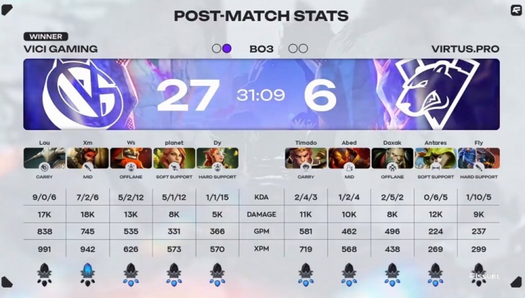 首局比赛VG对线三路优势,12分钟Xm兽王控盾掌握局势!不过随后Xm带盾连死两次一度让VP看到了希望!不过团战端Ws马尔斯框大发力,VG在魔晶团打出0换3之后重新拿回主动权!随后的比赛VG没再给机会,连续赢团控下二代肉山之后拆掉两路高地,拉开两万经济差!VP绝命一搏强开Xm兽王失败敲出GG!