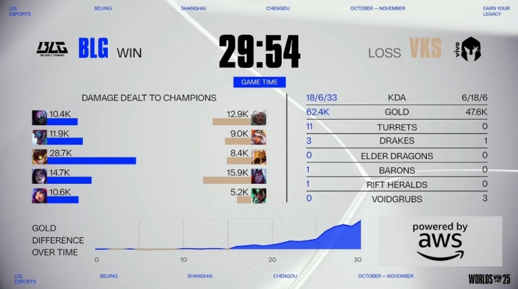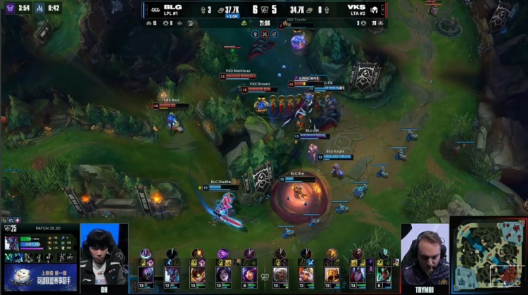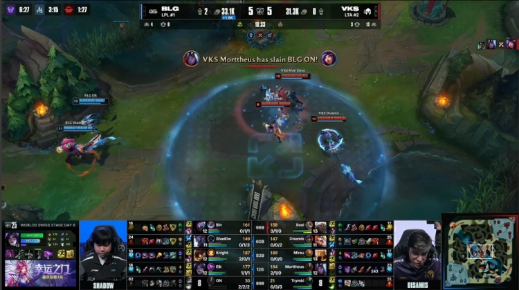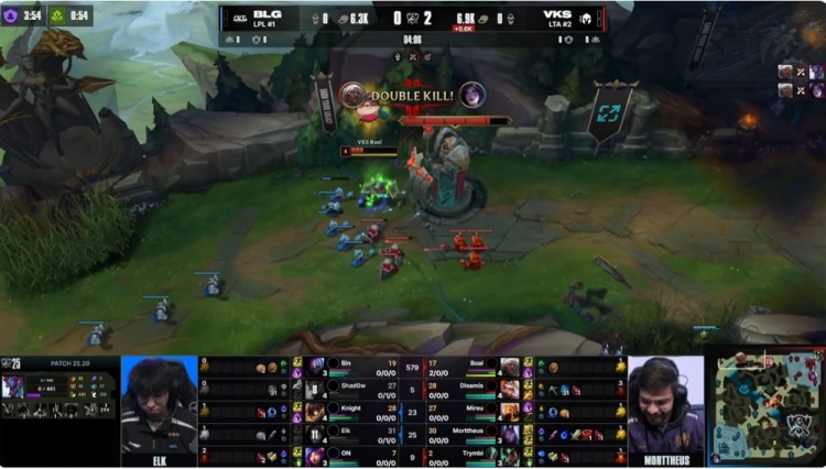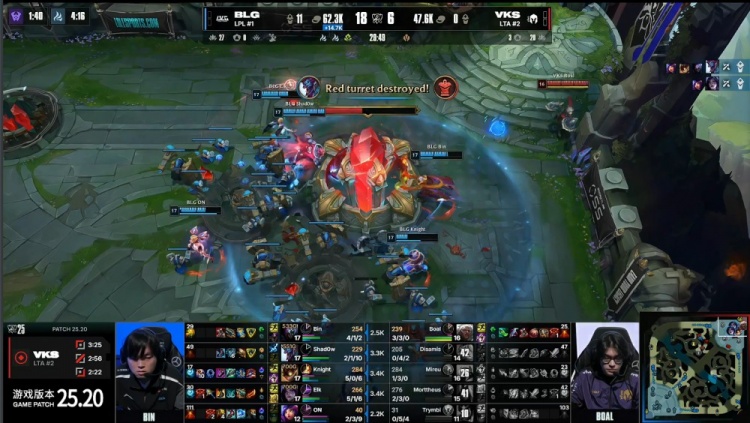中期BLG吃掉先锋强行上路越掉Boal后推掉VKS二塔,中路ON妮蔻再送一个,Boal下路1v2被阿Bin联手Elk击杀,BLG经济领先2k。