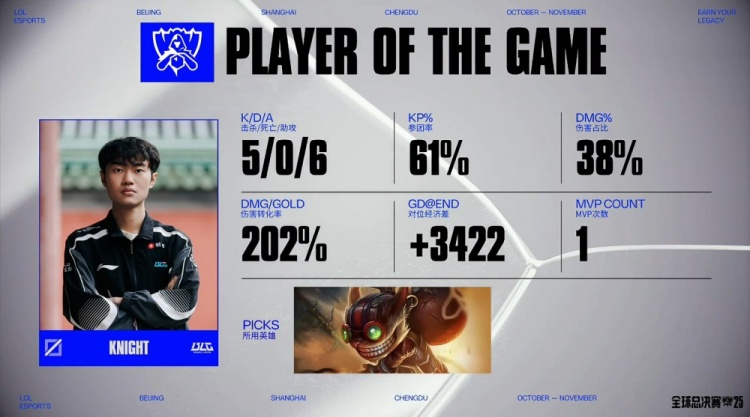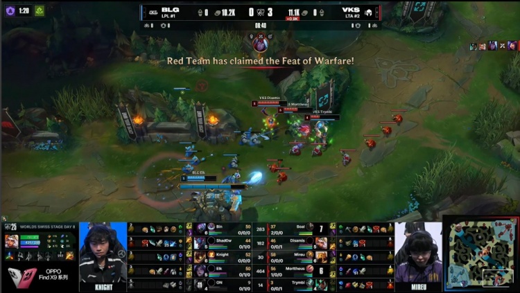 后期厄塔汗团战,Mireu沙皇致命空大被knight吉格斯反杀,VKS后续正面团战毫无一战之力,BLG轻松拿到大龙推平VKS三路后拆掉基地先下一城。