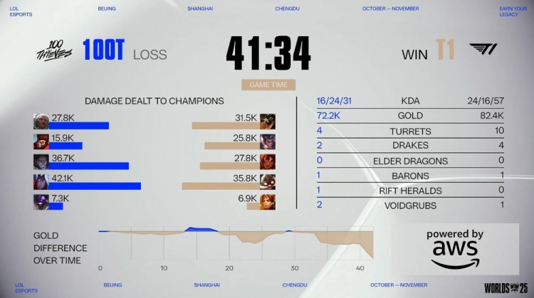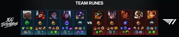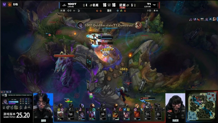 中期River猴子抢掉厄塔汗,但100T正面惨遭T1打出0换3,T1随后听牌火龙魂,Oner赵信河道被套虚弱遭100T强杀得手,100T拿到大龙但经济落后1k。