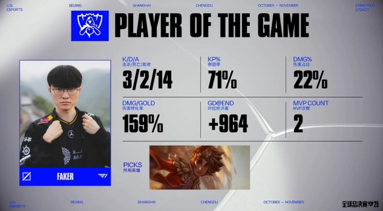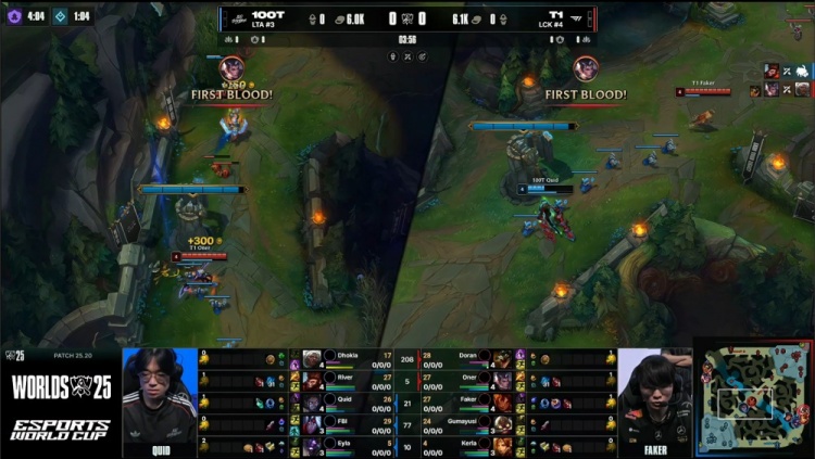 第一局前期Oner赵信去上配合多兰轻松越掉Dhokla安蓓萨,但后续Oner继续去上却送Dhokla双杀,同时中路Quid塞拉斯单杀Faker岩雀,Faker复活点爆炸果实来河道又被Quid与Eyla牛头逮捕连死两次。小龙团Oner赵信爆捅独自收获三个人头稳住局势。