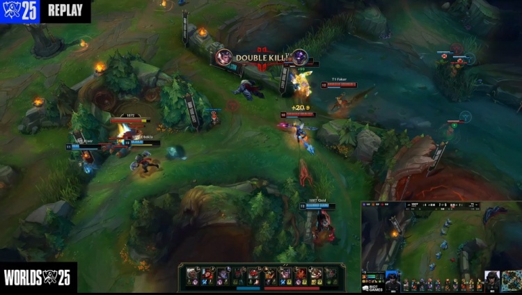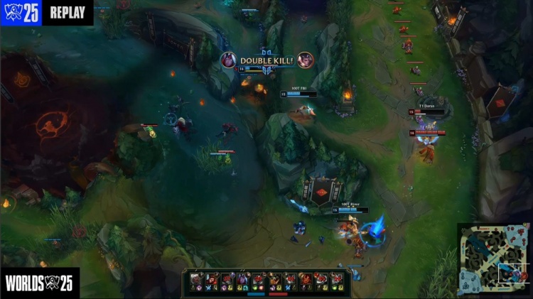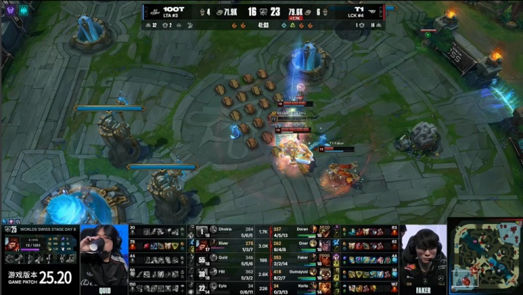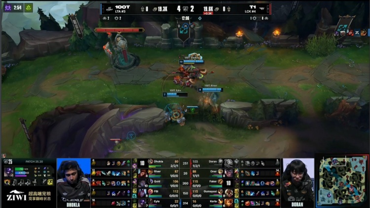 【10:35】Oner赵信继续来上gank,Dhokla安蓓萨塔下山交闪开秀利用防御塔先杀Oner再换Doran鳄鱼,Dhokla拿到双杀,同时Quid塞拉斯中路线上单杀Faker岩雀,100T随后三人越上再杀多兰鳄鱼,100T整体打出1换4,双方经济持平。