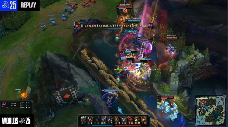 【21:01】厄塔汗团战,River猴子抢掉厄塔汗但被Faker岩雀击杀,正面100T毫无一战之力,T1打出0换3,推掉100T上路二塔,经济领先4k。