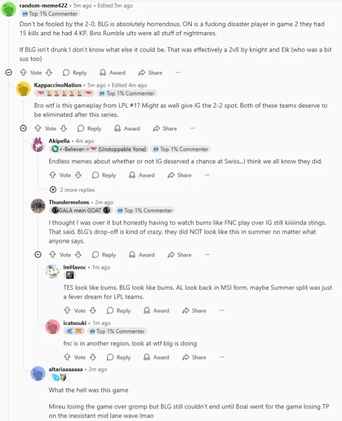 兄弟,这tm是LPL一号种子打出来的比赛吗?还不如把2-2的位置给IG,看完这场系列赛,这两支队伍都该被淘汰。