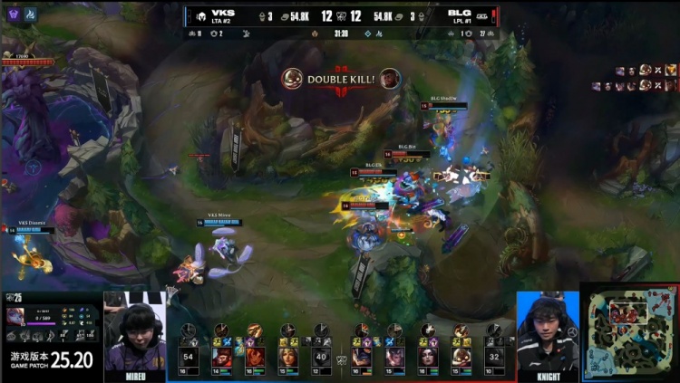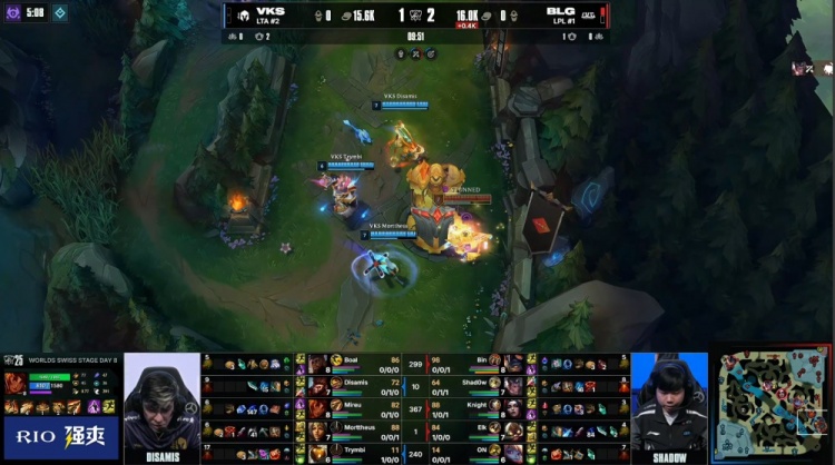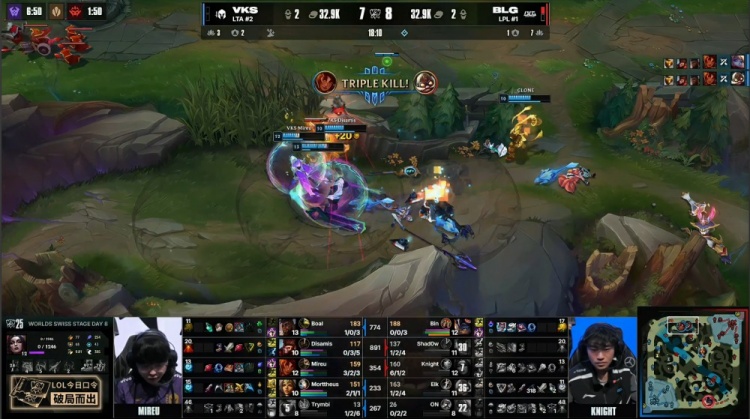 【17:30】knight妖姬上路被VKS四人逮捕,Boal奎桑提拿到一千大米,上路继续混战,shadow赵信捅人开团被Mireu击杀,BLG两人接连送Mireu三杀,随后knight妖姬复活击杀Mireu,VKS打出1换4,双方拉开,经济持平。