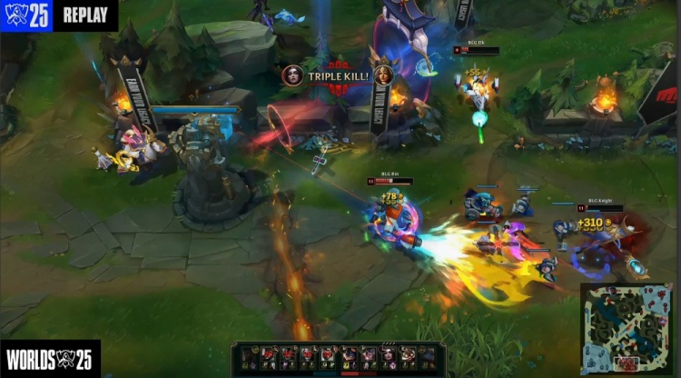【14:22】下路混战,ON波比被Mireu岩雀抬飞送Morttheus希维尔人头,阿Bin兰博TP下来开大封路,knight妖姬回马枪先杀Mireu再杀Disamis与Morttheus,狂轰三杀,BLG打出1换4。