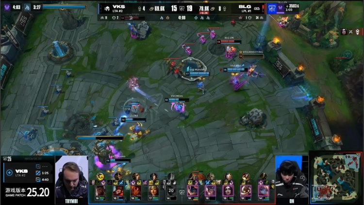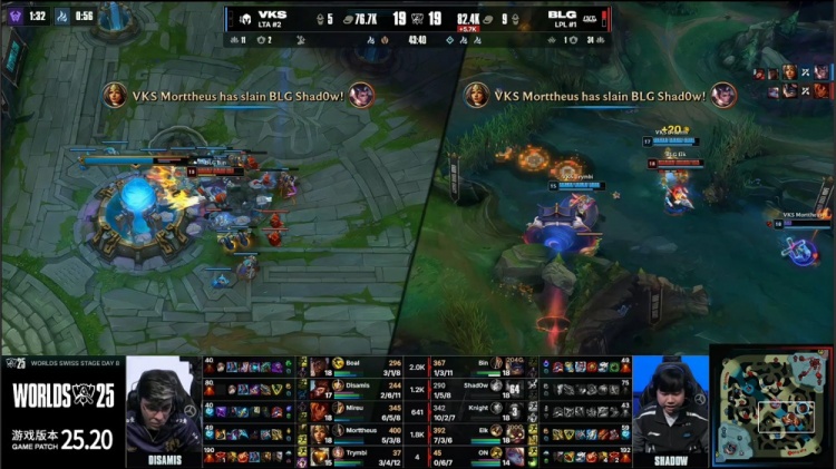 【40:12】BLG下路推进冲上VKS高地,Elk导弹轰掉Trymbi巴德,大军压境,高地之上Morttheus希维尔击杀复活甲起身的shadow,VKS守住高地,经济落后8k。
