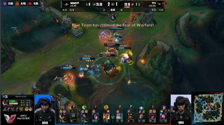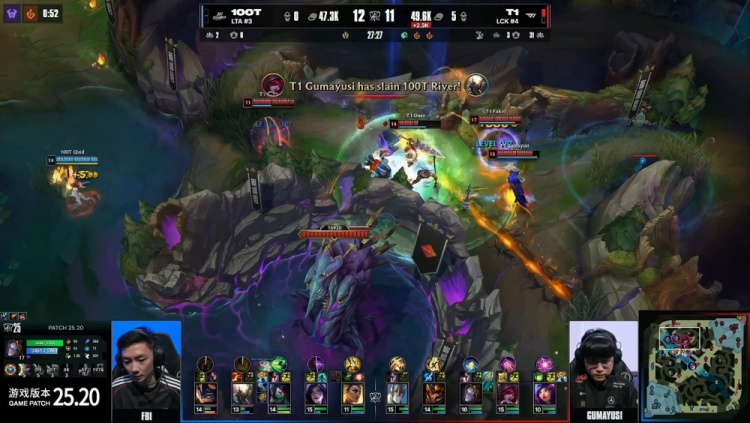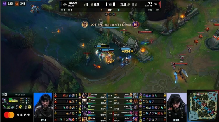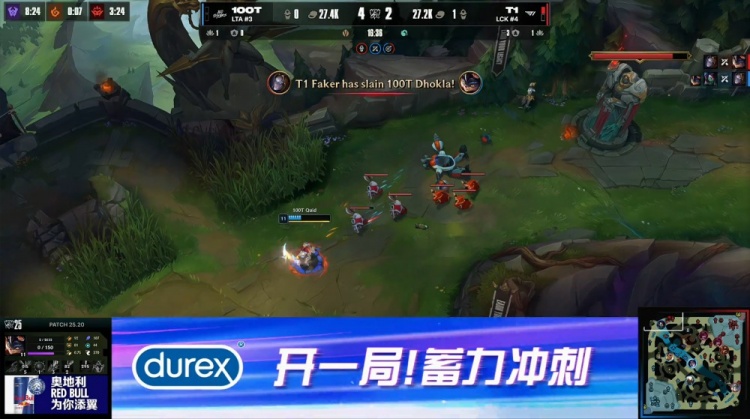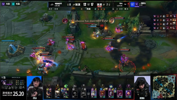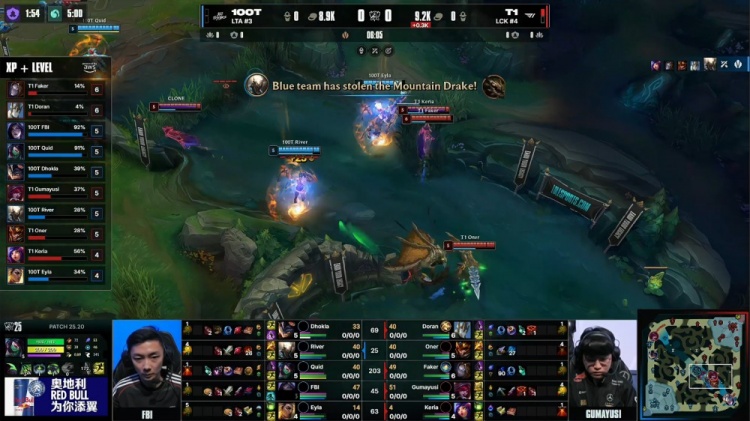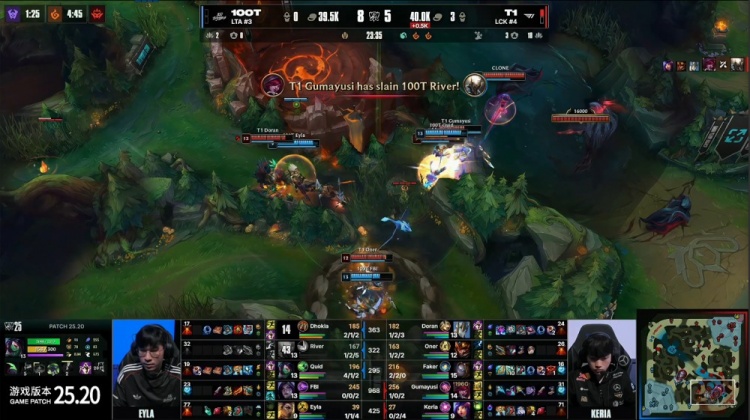 【25:02】大龙团,小吕布走位失误击杀Eyla后被River潘森击杀,T1打出1换3,推掉100T中路一塔与上路二塔,经济领先4k。