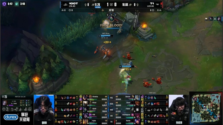 【7:12】River潘森跳大来中落地直接控住Faker发条,Quid阿卡丽跟上吃掉Faker一血。