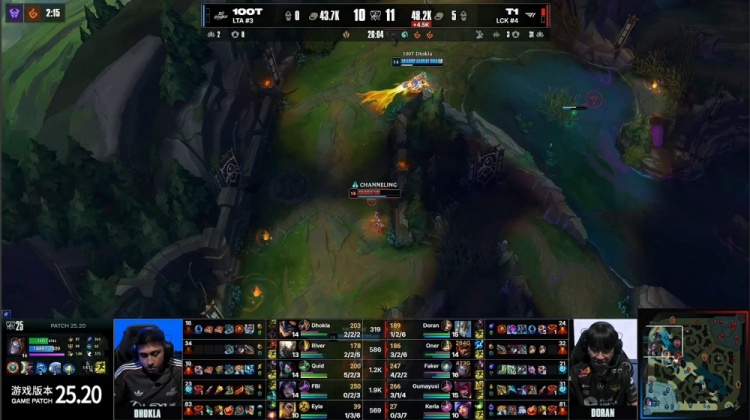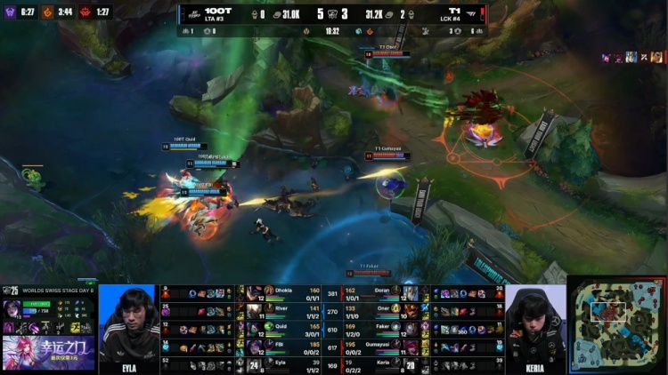 第二局前期Oner惩戒失误,River潘森抢掉4滴血小龙,随后River潘森两度中路跳大击杀Faker发条与Keria妮蔻。随后双方多次1换1,经济持平。
