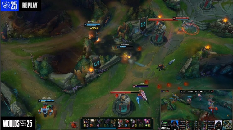 【19:54】多兰下路吃线被100T三人逮捕,Dhokla兰博拿到终结人头,100T下路放出先锋牵制,双方持续拉扯后拉开。