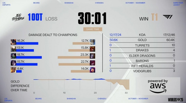 后期大龙团小吕布走位失误被杀,Quid阿卡丽切掉Faker,但随后龙坑之上Oner皇子扣飞100T上野,T1轻松拿到大龙下路推进再度融化100T,一波推平100T基地拿到比赛胜利,T1晋级2-2组,100T瑞士轮1-3告别S15。