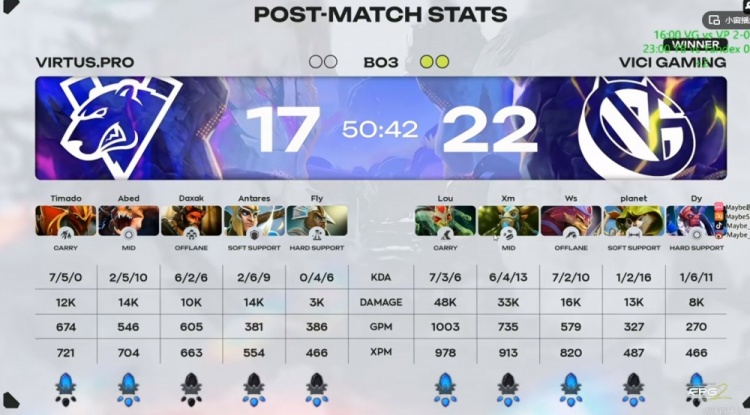 第二局比赛VP前中期一度依靠阵容强势先行带盾,拿下两个魔晶一度拥有一万经济优势,但是VG三核经济一直没有落后,耐心拖到了Lou美杜莎装备成型,在一波肉山团Lou美杜莎站桩输出拉满帮助队伍拉回局面,虽然Lou美杜莎推高白给导致双方互相打出超级兵,但是最终Lou美杜莎带盾配合队友拆家结束比赛,VG拿下瑞士轮首胜!