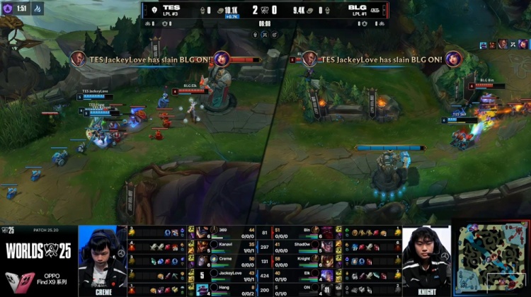 第一局前期Kanavi皇子上下两路gank取得成效,BLG双人组合砍0-4,hang布隆中路击飞knight吉格斯帮助Creme发条收头。小龙团哥哥卢锡安走脸被shadow赵信捅飞暴毙,BLG中路四人随后再次逮捕哥哥+hang,BLG逐渐逆转前期劣势。