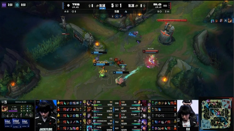【25:06】BLG入侵TES野区,ON妮蔻开TES两人,哥哥与Kanavi轻松被融化,BLG打出0换2回头吃掉大龙,经济领先8k。