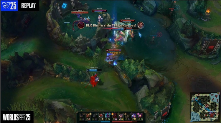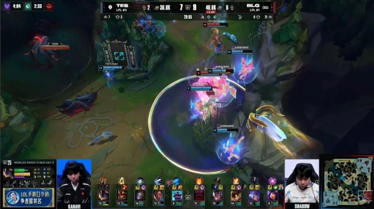 【19:06】阿Bin上路推线被TES三人逮捕,中路Creme发条瞬间被融,BLG推掉TES中路高地塔,经济领先3k。