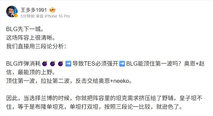 BLG炸弹消耗💣💣💣➡️导致TES必须强开➡️BLG能顶住第一波吗?奥恩+赵信,最能顶的上野。