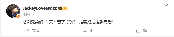 TES在八强的对手为G2,JKL刚刚更新微博,就晋级八强分享他的感受: